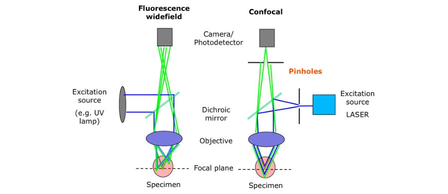 Un microscope confocal réalise des images de très faible profondeur de champ en positionnant le plan focal de l’objectif à différents niveaux de profondeur dans l’échantillon. Un balayage (scan) en x-y-z permet de réaliser des séries d’images à partir desquelles on peut obtenir une image 3D.