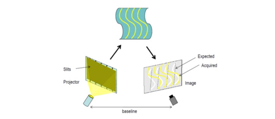 Une lumière structurée (motif connu) est projetée sur l’objet. Le motif lumineux sera déformé par l’objets et le motif observé par la caméra sera donc différent de celui initialement projeté. En déterminant le décalage de chaque pixel dans le motif, il est possible de déterminer la profondeur d'un point donné dans le champ de vision de la caméra. Les interférences entre deux Lasers peuvent aussi être utilisées pour créer le motif (laser interference method).