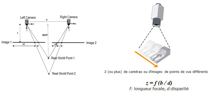 QMT Vision InspectorLes coordonnées 3D des points visibles de la surface de l’objet sont déterminées à partir de 2 images (ou plus) de différents points de vue. Ceci est fait en calculant la carte de disparité de la configuration des caméras étalonnées.