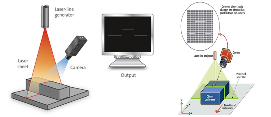 Une ligne (ou un point) laser est projetée sur un objet et est observée par une caméra avec un certain angle connu. Les différences de hauteur de l’objet le long de la ligne laser (z) correspondent aux différences de hauteur z’ vues sur le capteur. En fonction de z’ et de l’angle de la caméra, les distances z sont calculables. Une ligne ou un point laser balaient l’objet et une caméra reconstruit l’image.