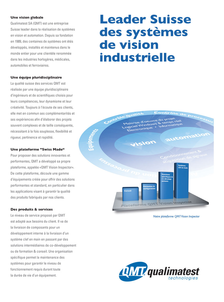 Depuis la fondation de QMT en 1989, des centaines de systèmes ont été développés, installés et maintenus dans le monde entier pour une clientèle renommée dans les industries horlogères, médicales, automobiles et ferroviaires.