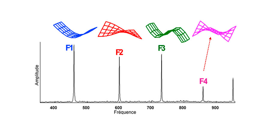 chaque mode de vibration (bleu, rouge, …) apparaît à une fréquence précise avec une certaine amplitude propre à lui